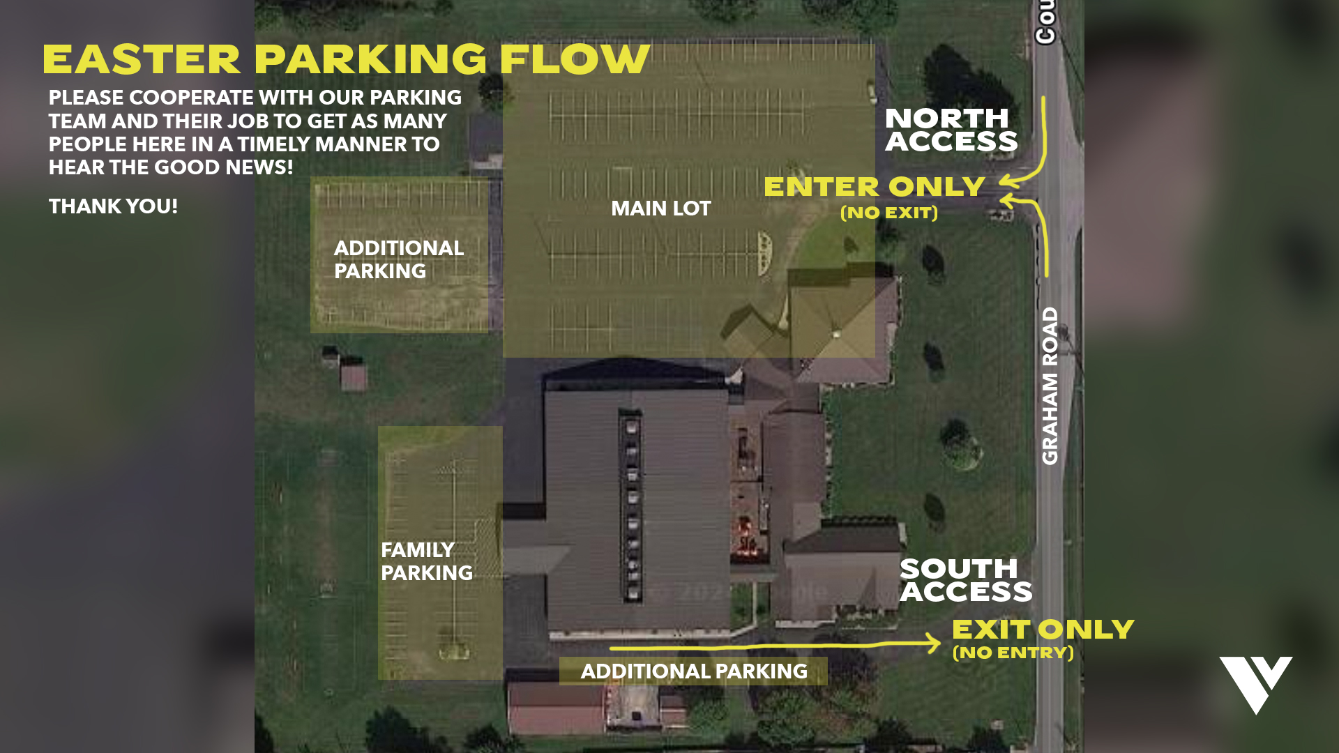 We’re expecting a full house! Our Parking Team will guide you when you arrive, and Family Parking is available in the west lot (Door 24) for those bringing kids and students. Just follow the smiles! First time guest parking is also available right outside our main entrance at door 3. Parking flow will continue as normal with our North access to Graham Road being an enter only and our south access an exit only. The parking team will guide you through this flow. (See Parking Map Here)